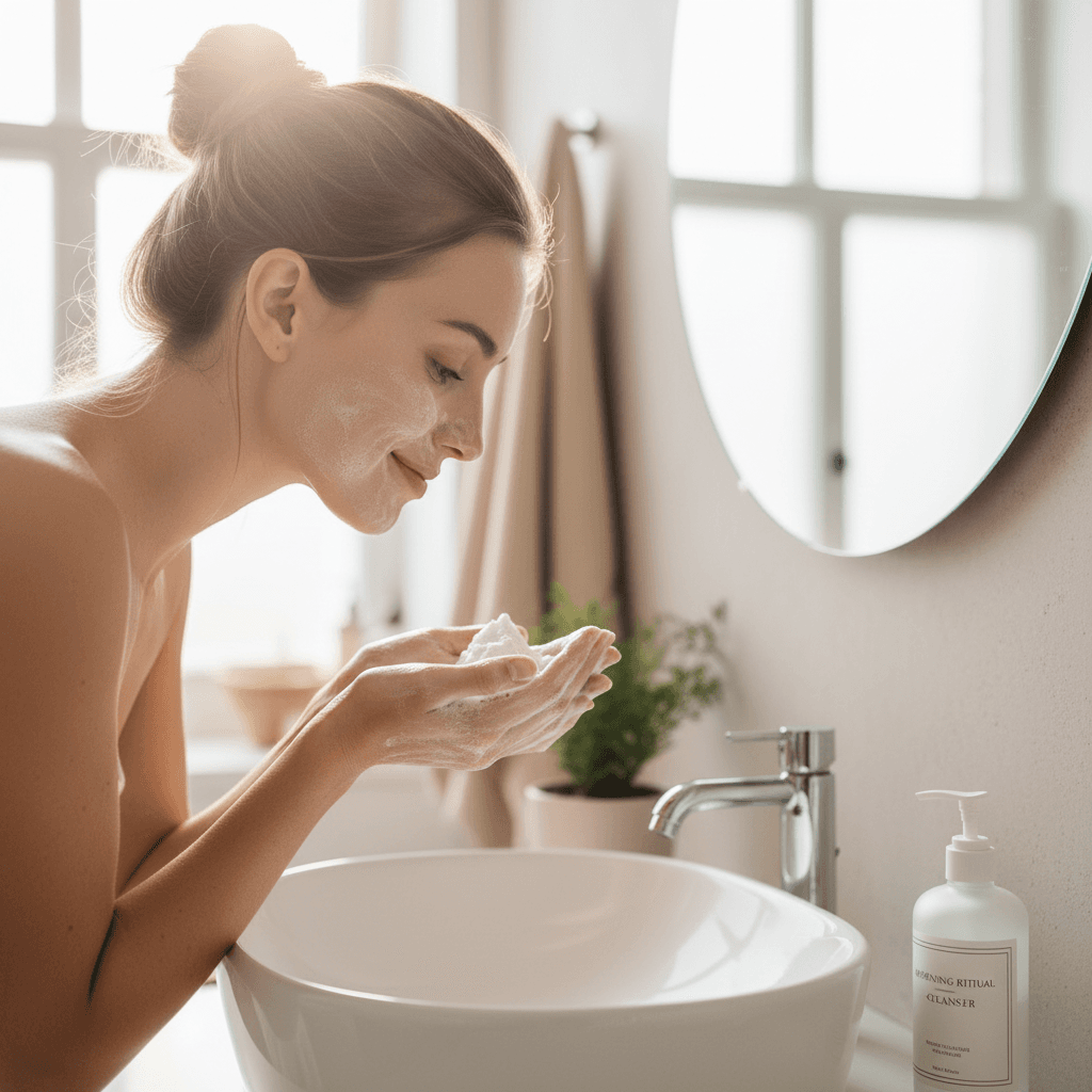 Tutorial prático de rotina com água micelar para pele seca. Cada passo explicado com produto sugerido, desde a limpeza suave até a proteção solar e hidratação.